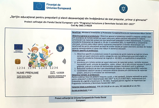 Obiectivul general al proiectului constă în creșterea nivelului de participare la educație al preșcolarilor și elevilor dezavantajați, prin acordarea de tichete sociale pe suport electronic pentru sprijin educațional, în acord cu prevederile Ordonanței de Urgență nr. 83 din 12 octombrie 2023, cu modificările și completările ulterioare, privind unele măsuri pentru susținerea preșcolarilor și elevilor dezavantajați.